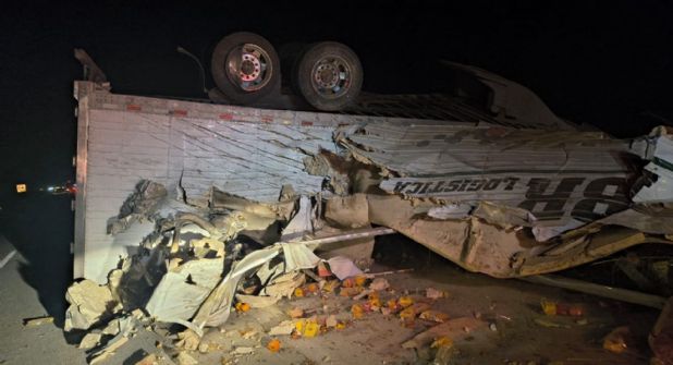 La cabina del camión y su caja quedaron fuertemente dañadas debido al impacto, y el área alrededor del vehículo se llenó de cajas de cartón y envoltorios de pimientos esparcidos en el pavimento.