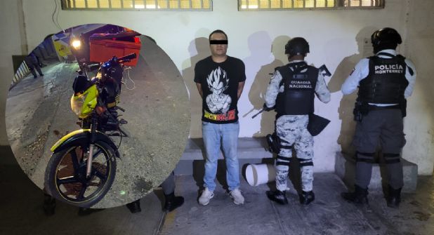 Un hombre que circulaba a bordo de una motocicleta presuntamente robada, luego de que no contaba con documentos, no portaba placa para circular y la serie está alterada, como parte del Operativo Monterrey Seguro, entre la Guardia Nacional y la Policía de Monterrey