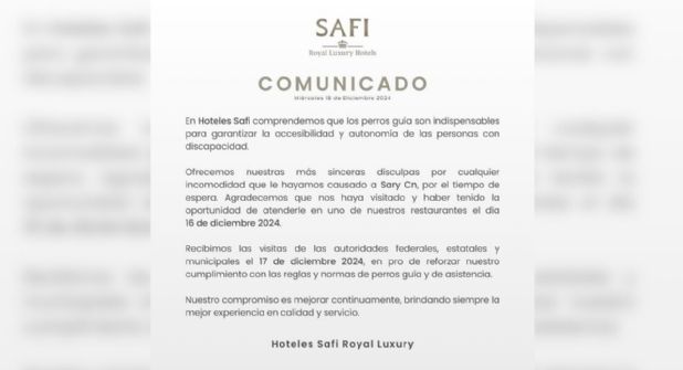 Tras el incidente en el que una mujer con discapacidad visual fue rechazada del Hotel Safi debido a la negativa de permitir la entrada de su perro guía, y tras la reacción del gobernador Samuel García calificando el acto como discriminación, el hotel emitió un comunicado al respecto.