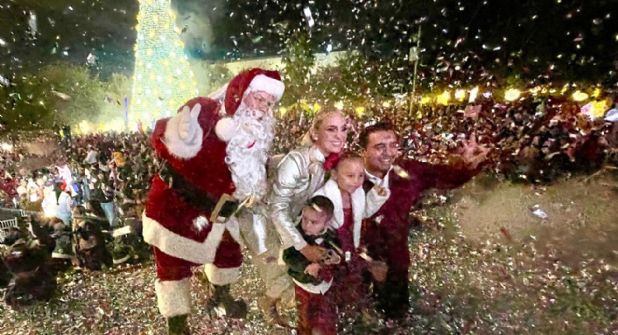 La Torre Administrativa se vistió de luces multicolores, en donde se presentó la cuenta regresiva y el edil y su familia encendieron el macro pino de Navidad.