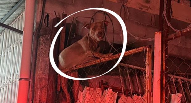 Una perra de raza pitbull fue auxiliada tras quedar atrapada entre un alambre acerado y alambre de púas en la calle Privada Galeana.