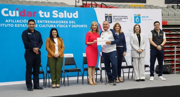 El evento se llevó a cabo en el Gimnasio Nuevo León, donde se realizó la entrega de tarjetas del programa 'Cuidar tu Salud' a varios entrenadores del INDE.