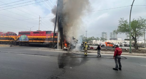 La cabina de un tren comenzó a incendiarse luego de estrellarse contra un tractocamión que intentó ganarle el paso en el municipio de Monterrey.