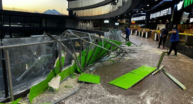 Se cree que las fuertes corrientes de aire registrada en la entidad durante los últimos días debilitaron la fachada de la plaza comercial.