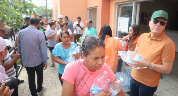 Acompañado por Alfonso Martínez Muñoz, Secretario de Medio Ambiente del Estado, se entregaron botellas de 1.5 litros a las familias que han sufrido el corte del suministro de agua desde el 19 de junio, cuando la tormenta tropical "Alberto" dañó la tubería de Servicios de Agua y Drenaje de Monterrey.