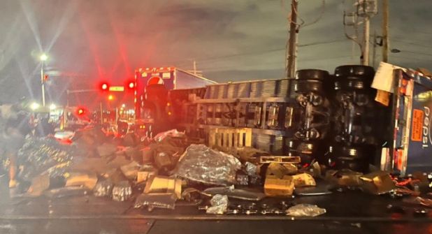 Un tráiler de doble remolque, propiedad de la empresa refresquera Pepsi, fue golpeado por un tren. El impacto volcó el segundo remolque, esparciendo cajas de refresco por el suelo.