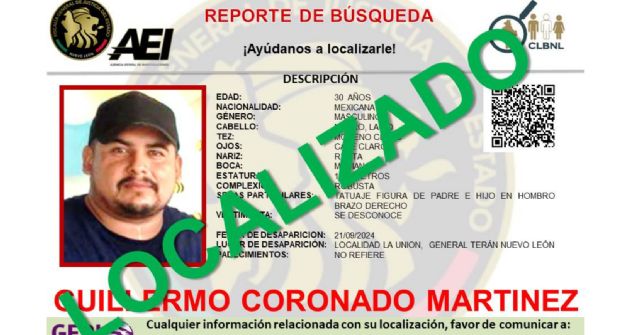 Cabe destacar que el caso de Guillermo Corona Martínez, fue dado a conocer junto al reporte de una familia desaparecida en el municipio de General Terán, de quienes el Grupo Especializado de Búsqueda Inmediata (GEBI) emitió las fichas correspondientes para dar con su paradero el 22 de septiembre.