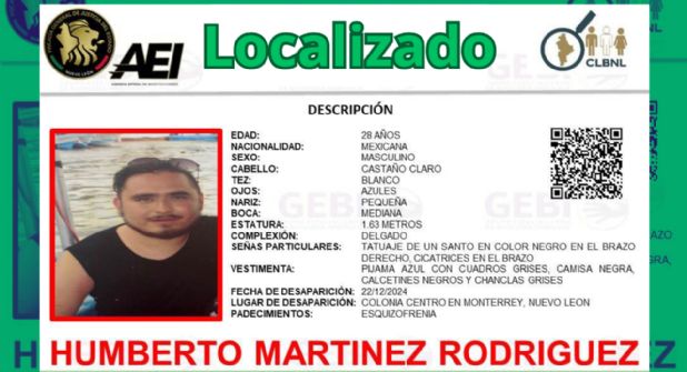 Policías municipales de Guadalupe localizaron a Humberto Martínez Rodríguez, un hombre de 28 años con esquizofrenia, quien había sido reportado como desaparecido desde el pasado 22 de diciembre en el centro de Monterrey.