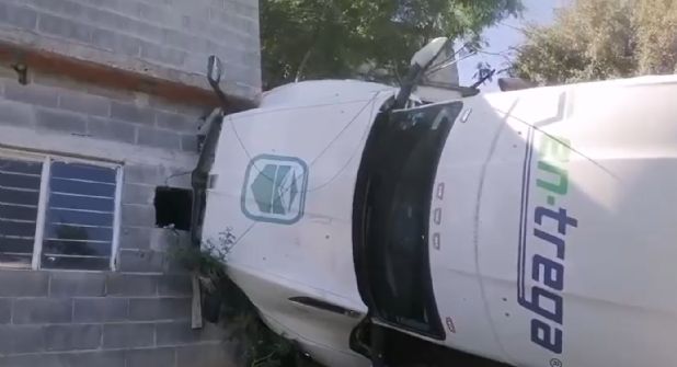 La unidad de carga, un tractocamión con caja cerrada, terminó volcada sobre su lado izquierdo, ocasionando daños en la barda de un domicilio y dejando lesionado al conductor, quien fue atendido por paramédicos en el lugar.