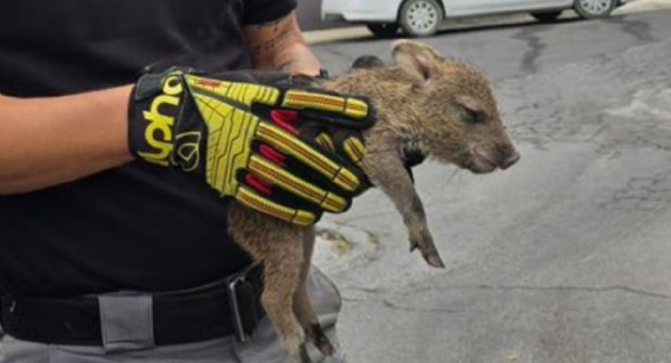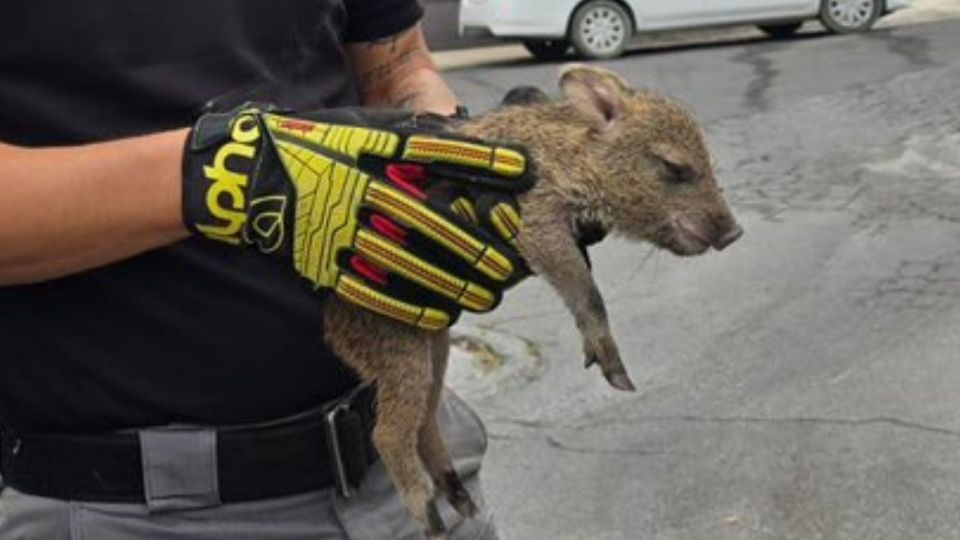 Una cría de pecarí de aproximadamente un mes de edad fue rescatada la mañana de este martes en la colonia Contry La Silla, en Guadalupe, luego de caer a una alcantarilla mientras seguía a su madre por las faldas del Cerro de la Silla.