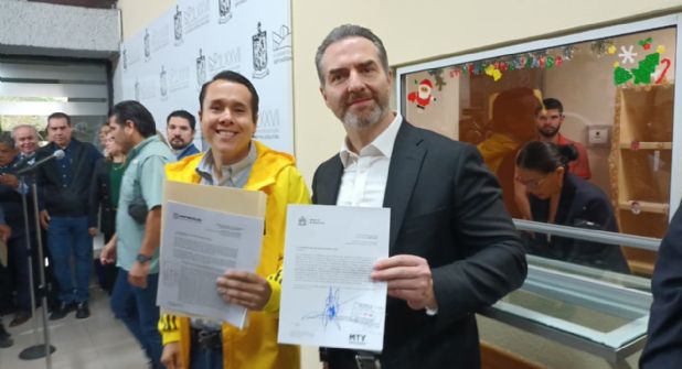 Los alcaldes de Monterrey, Adrián de la Garza, y de San Nicolás de los Garza, Daniel Carrillo Martínez, entregaron en la Oficialía de Partes la documentación derivada de la aprobación unánime de sus respectivos Cabildos, con la cual se redefinen los límites municipales en la zona donde se desarrollará el proyecto.