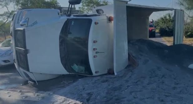 Un camión materialista que transportaba 14 toneladas de arena volcó la mañana de este miércoles en la Autopista al Aeropuerto, en el municipio de Guadalupe, provocando afectaciones viales en sentido hacia la terminal aérea.