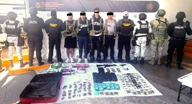 Durante la revisión, se les aseguraron dos armas de fuego calibre .223 y .9 con sus respectivos cargadores, 144 dosis de presunta marihuana, 8 cajas con juguetes empaquetados con la leyenda “CDN”, dos básculas digitales, cuatro celulares, una maleta de viaje color rojo y equipo táctico.