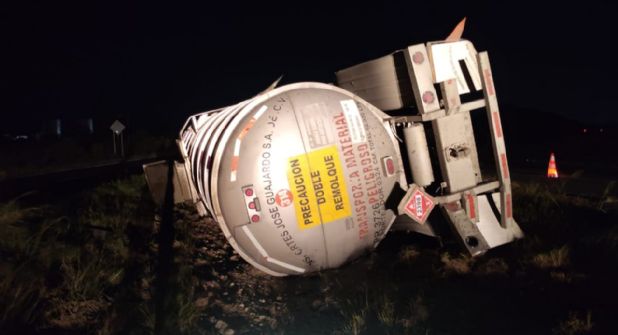 Una pipa quedó volcada sobre la Carretera Nacional en Montemorelos, luego de un accidente vial que involucró a un camión con doble remolque, el cual terminó sobre el camellón central y provocó el derrame de un químico transportado en el autotanque.