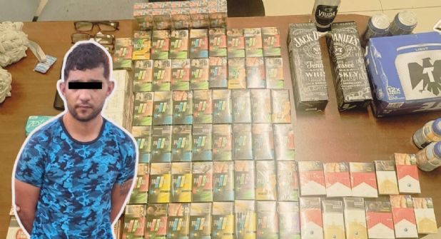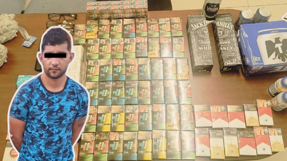 Durante la revisión, los policías le localizaron un cuchillo entre sus pertenencias, además de cinco envoltorios con hierba verde y seca con las características de la marihuana. En las bolsas que transportaba también se encontraron botellas de whisky, latas de cerveza y 79 cajetillas de cigarros, entre otros productos.