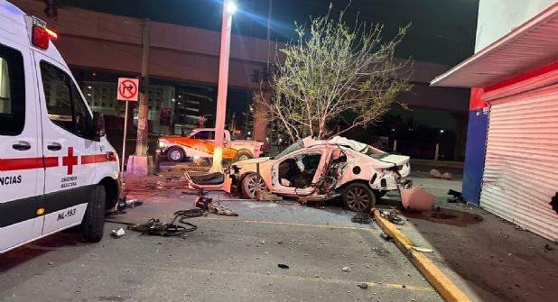 Un fuerte accidente vial ocurrió en el cruce de Av. Madero y Av. Venustiano Carranza, en el Centro de Monterrey, donde un vehículo Mazda blanco impactó primero un poste y luego un local comercial.