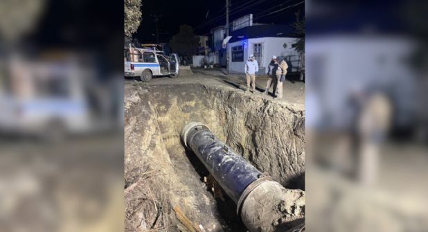 El trabajo de reparación se inició de inmediato y, durante la madrugada del viernes, cuadrillas de Agua y Drenaje continuaron con los trabajos de soldadura de la nueva tubería de acero que reemplazó la dañada.