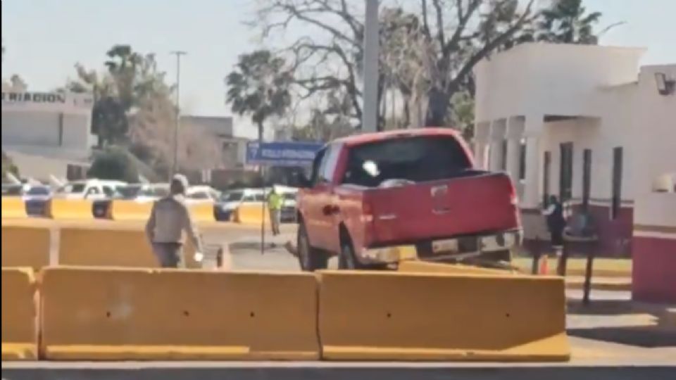 A través de redes sociales se viralizó el momento en el que la camioneta pick-up doble cabina en color rojo no obedeció la señal de alto que le marcaran los elementos de Guardia Nacional en el cruce fronterizo.