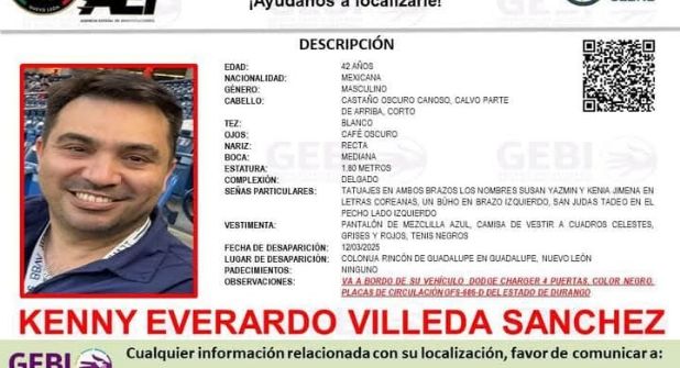 Familiares y autoridades buscan a Kenny Everardo Villeda Sánchez, un aficionado de Rayados de Monterrey que desapareció tras viajar a Torreón para asistir al partido de su equipo contra Vancouver.
