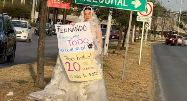 La afectada sorprendió a los transeúntes del centro de Monterrey y a automovilistas sobre la avenida Concordia, en Apodaca, al aparecer con su vestido de novia y una cartulina exigiendo la devolución de su dinero.