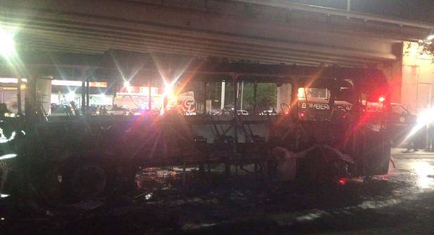 Un camión de la Ruta 88 Cosmópolis se incendió por completo durante la noche de este viernes en el cruce de Avenida Sendero y su cruce con Universidad, en San Nicolás de los Garza.