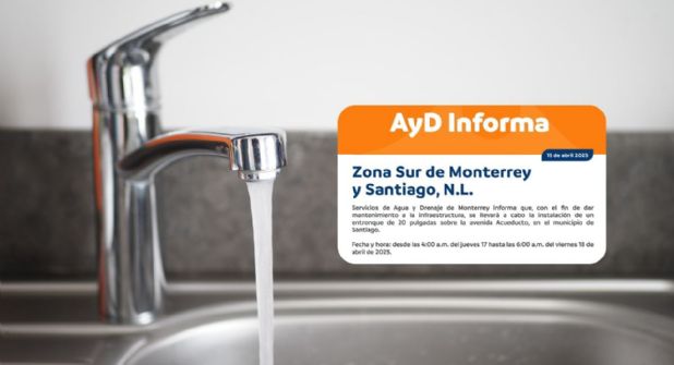 De acuerdo con la información proporcionada por AyD de Monterrey, la suspensión del suministro se realizará a partir del jueves 17 de abril a las 04:00 horas, y se prevé que concluya a las 06:00 horas del viernes 18 de abril de 2025.