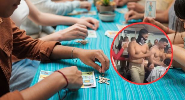 En las imágenes difundidas, se observa a varias mujeres reunidas en mesas participando en la lotería, mientras un grupo de hombres sin camiseta realiza bailes eróticos que interrumpen el desarrollo del juego.