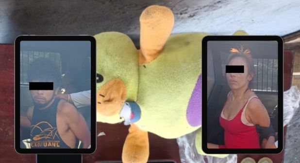 Durante un recorrido de vigilancia, elementos de la Policía de Monterrey detuvieron a una pareja que presuntamente transportaba marihuana oculta dentro de un muñeco de peluche.