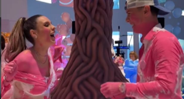 La fiesta se llevó a cabo este viernes donde la pareja se encontraba en el templete, pero al activarse la zona rosa, la pintura cubrió el piso, y la creadora de contenido perdió el equilibrio en dos ocasiones, cayendo de rodillas frente a sus invitados.