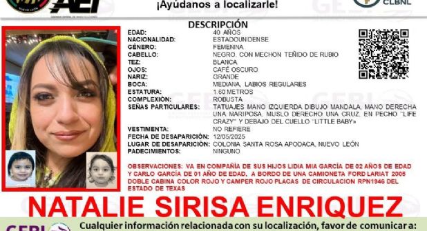 Según la denuncia presentada por familiares, Natalie, de 40 años, iba acompañada de sus hijos Lidia Mia García, de 2 años, y Carlo García, de 1 año. Al momento de su desaparición, se trasladaban a bordo de una camioneta Ford Lariat modelo 2005, doble cabina, color rojo con camper, con placas de circulación RPN-1946 del estado de Texas.