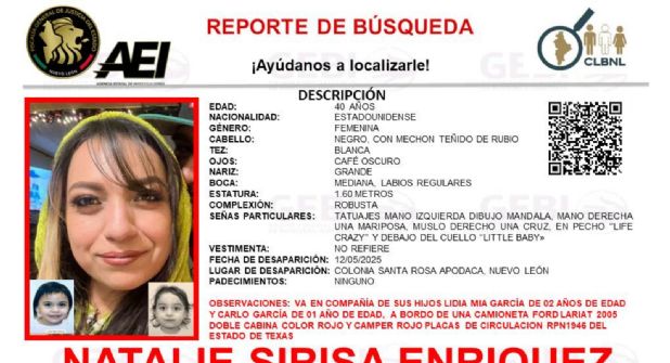 Se trata de Natalie de 40 años, quien iba acompañada de sus hijos Lidia Mia García de 2 años y Carlo García de 1 año. Al momento de su desaparición el pasado 12 de mayo, se trasladaban a bordo de una camioneta Ford Lariat modelo 2005, doble cabina, color rojo con camper, con placas de circulación RPN-1946 del estado de Texas.