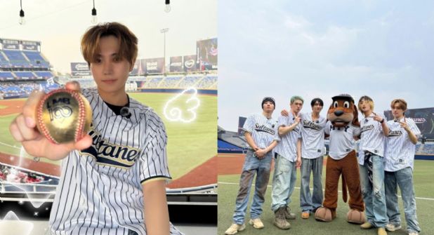Jimin, Geonu, Bain, JM y Sangwoo sorprendieron a only-b regia al aparecer en el campo de juego, donde no solo saludaron a sus fans, sino que también bailaron con la popular mascota del equipo, el perro Sultán.
