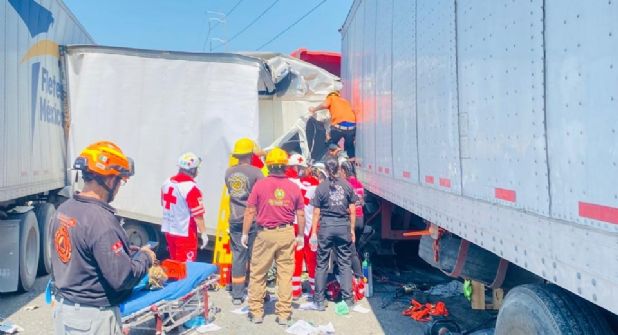 Un aparatoso accidente vial entre dos tráileres y un camión de carga registrado este jueves movilizó a diversas corporaciones de auxilio en el municipio de Escobedo, Nuevo León, donde uno de los conductores quedó prensado y tuvo que ser rescatado por personal de Protección Civil.