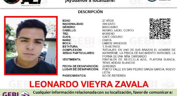 Las autoridades estatales dieron a conocer que se activó un operativo búsqueda para Leonardo Vieyra Zavala, un hombre de 27 años cuyo paradero se desconoce desde el pasado jueves 22 de mayo; se reporta que desapareció en el municipio de San Pedro.