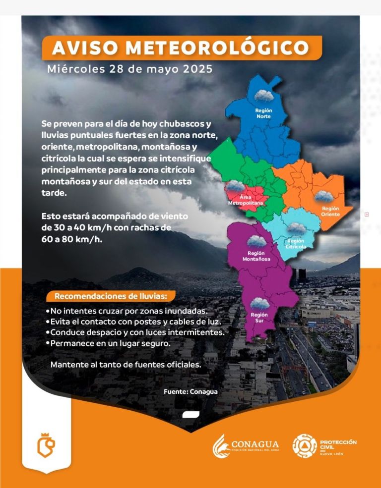 Protección Civil del estado emitió un aviso preventivo ante el ingreso de un frente fuera de temporada que, en combinación con diversos fenómenos atmosféricos, provocará condiciones meteorológicas adversas en la mayor parte del estado de Nuevo León.