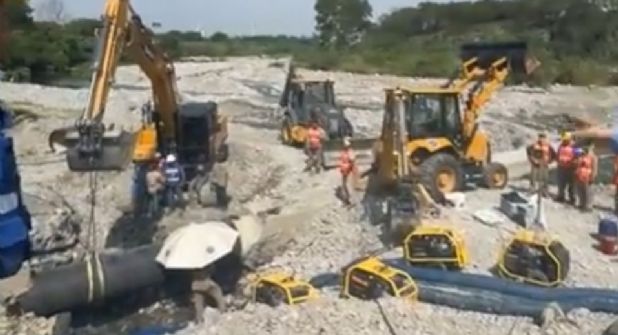 Las tuberías dañadas de concreto están siendo sustituidas por tuberías de acero, y una vez concluidas las soldaduras este mismo día, se realizarán los movimientos finales de válvulas para restablecer totalmente el servicio.