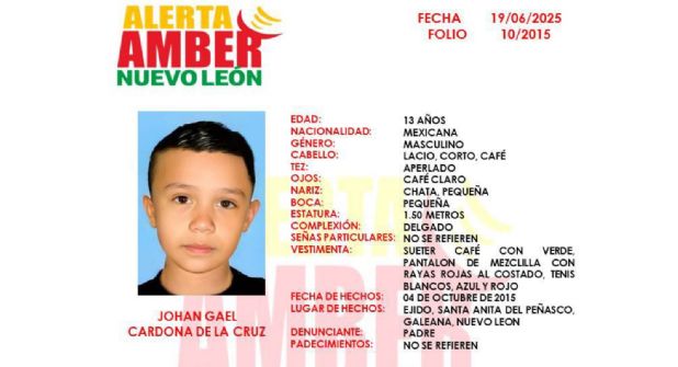 La Fiscalía General de Justicia de Nuevo León emitió un nuevo retrato progresivo del menor Johan Gael Cardona de la Cruz, desaparecido desde octubre de 2015, con el objetivo de facilitar su localización a casi 10 años del hecho.