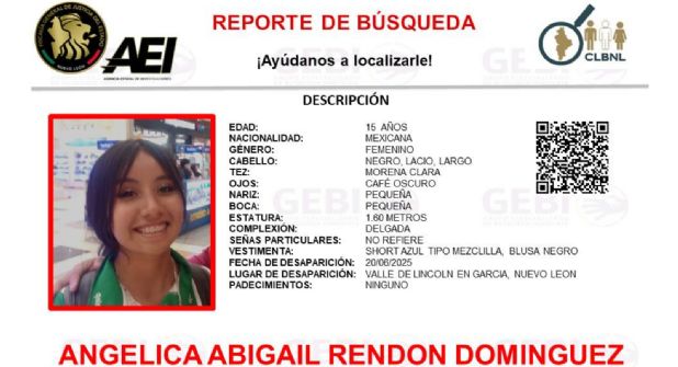 La Agencia Estatal de Investigaciones de Nuevo León, a través del Grupo Especializado de Búsqueda Inmediata (GEBI), emitió un reporte de búsqueda para localizar a Angélica Abigail Rendón Domínguez, quien desapareció en el municipio de García.