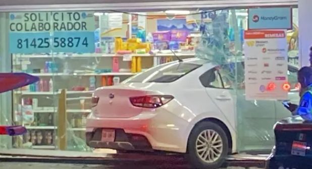 Un accidente en el que un vehículo se estrelló contra la fachada de una farmacia, en la colonia Roma del municipio de Monterrey.