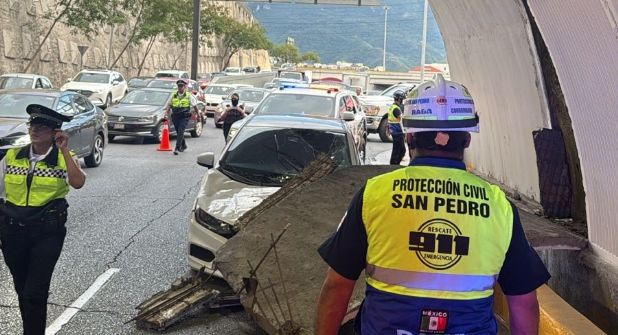 Un fuerte accidente se registró la tarde de este jueves en el Túnel de la Loma Larga, en el municipio de San Pedro Garza García, debido a la caída de una sección del muro de contención sobre un vehículo particular, luego de que un camión de mudanza golpeara la estructura mientras circulaba por el paso vehicular.