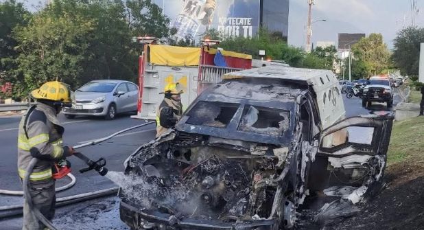 El fuego habría iniciado a causa de un probable cortocircuito, mismo que fue atendido de inmediato por Bomberos de Nuevo León, quienes lograron sofocar las llamas en el vehículo blindado.