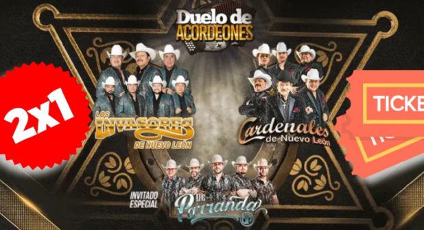 En promoción limitada, por lo que debes apurarte a apartar tus entradas al 2x1, Duelo de Acordeones te hará vibrar con los máximos exponentes del regional mexicano como lo son los ídolos de la música norteña Los Invasores de Nuevo León, así como la fortaleza norteña de Los Cardenales de Nuevo León, que nos deleitarán con todos sus éxitos.