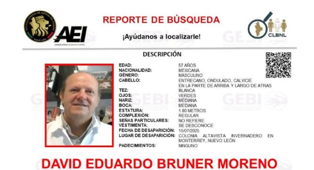 La Agencia Estatal de Investigaciones de Nuevo León, a través del Grupo Especializado de Búsqueda Inmediata (GEBI), emitió un reporte de búsqueda para localizar a David Eduardo Bruner Moreno, quien desapareció en Monterrey.