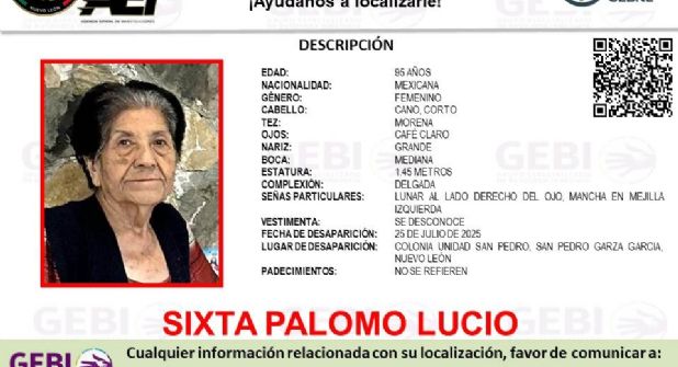 Se trata de Sixta Palomo Lucio, quien fue vista por última vez el día de ayer en la colonia Unidad San Pedro. De acuerdo con la ficha de búsqueda, la mujer de la tercera edad es de tez morena, complexión delgada y mide 1.45 metros. Tiene cabello color cano y corto, ojos café claro, nariz grande y boca mediana.