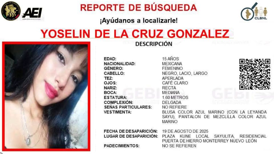 Según el reporte, la menor vestía blusa color azul marino con la leyenda "Sayu" y pantalón de mezclilla azul marino al momento de su desaparición. Tiene cabello negro, tez aperlada, mide aproximadamente 1.60 metros y es de complexión delgada.