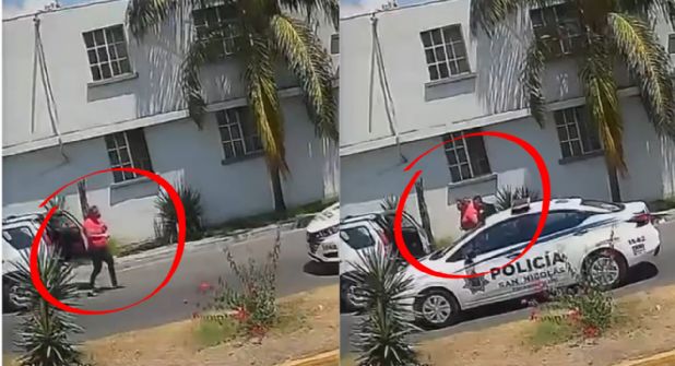 Una cámara de seguridad registró cómo un policía municipal detuvo su patrulla para socorrer a una mujer de 58 años que se estaba atragantando con un totopo.
