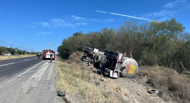 Un tráiler que transportaba una pipa de doble carga volcó a un costado de la carretera Nacional, en el municipio de Montemorelos.