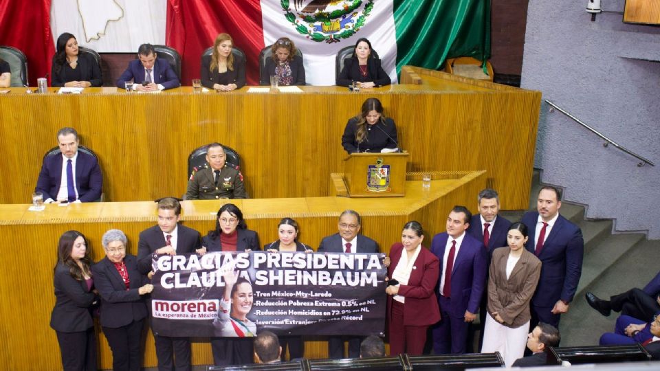 Durante el evento, diputados y alcaldes de Escobedo y García –Andrés Mijes y Manuel Guerra– mostraron su apoyo a Sheinbaum Pardo con una manta.