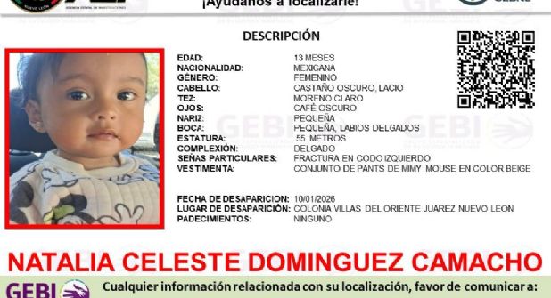 Las autoridades de Nuevo León activaron una Alerta Amber para localizar a Natalia Celeste Domínguez Camacho, una bebé de un año de edad que fue reportada como desaparecida en el municipio de Juárez.