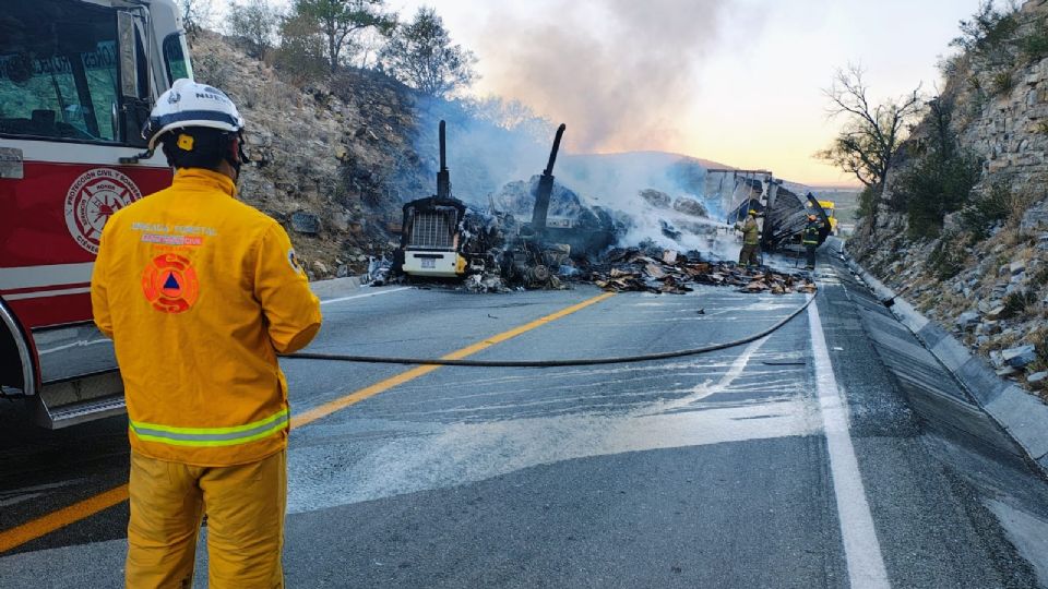 Elementos de Protección Civil de Nuevo León continúan trabajando en la zona para sofocar el fuego y retirar las unidades siniestradas, lo que mantiene interrumpida la circulación en una de las vías más importantes para el transporte de carga y el tránsito hacia la frontera con Estados Unidos.